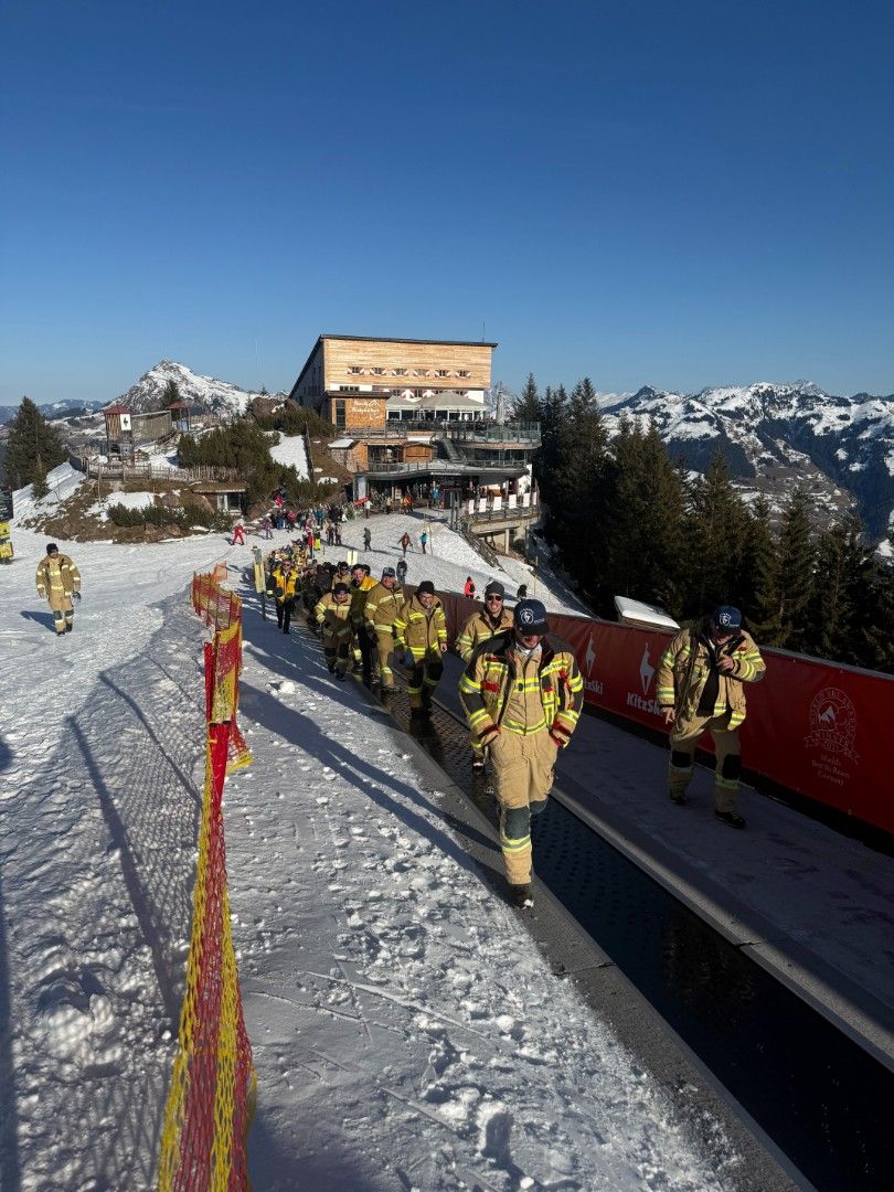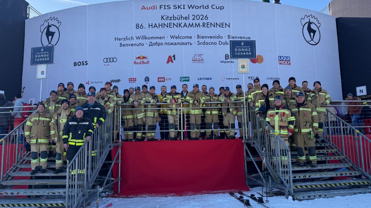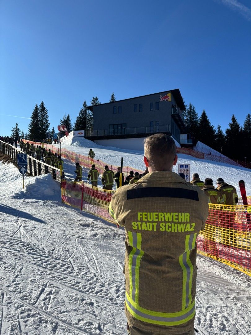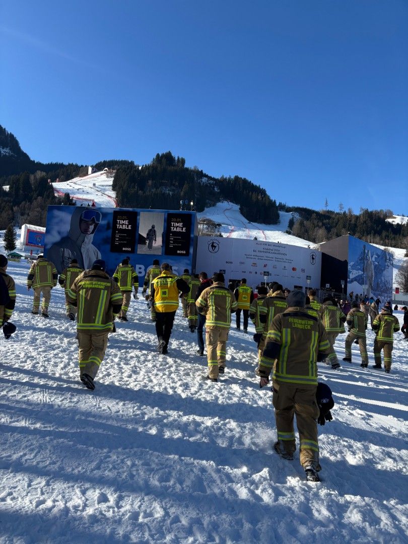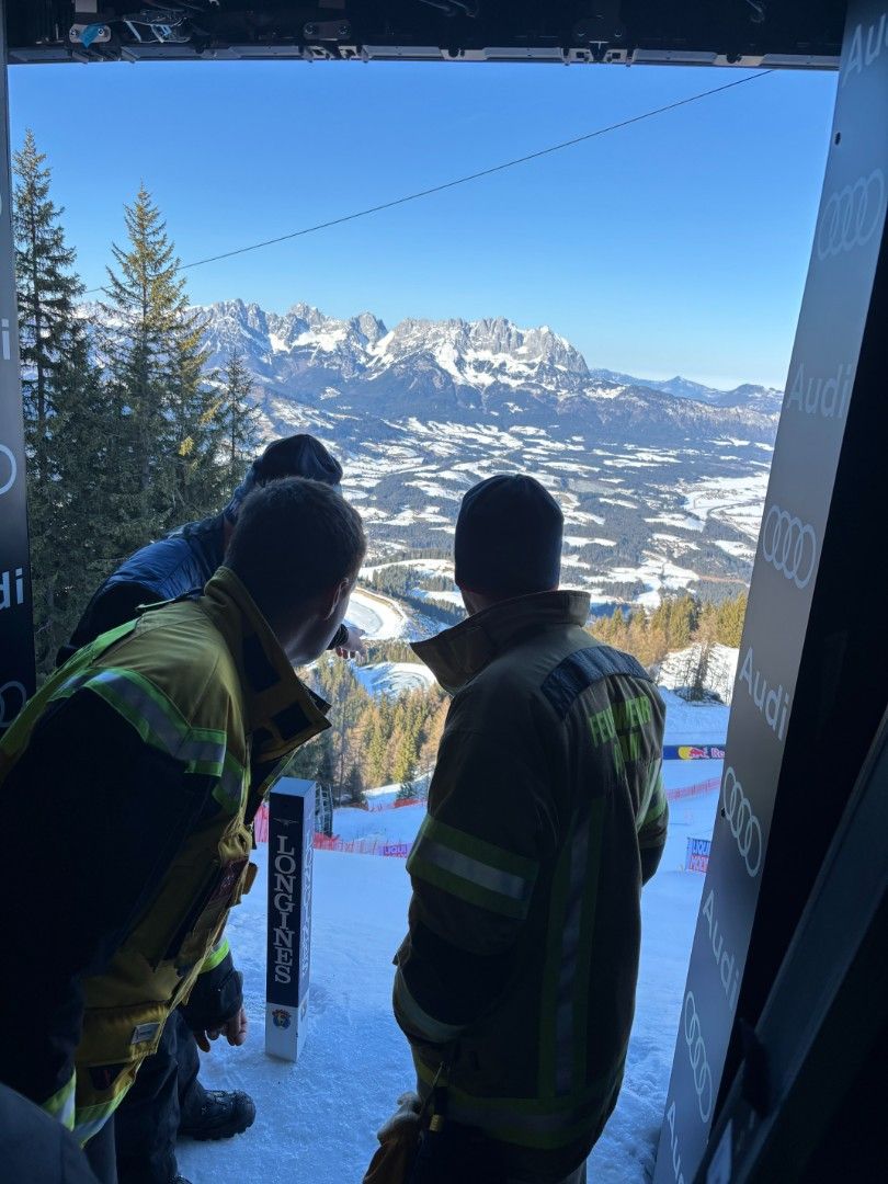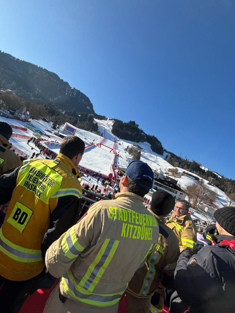 Tirols Schwerpunktfeuerwehren trafen sich im Rahmen der Hahnenkamm-Rennen zum Erfahrungsaustausch und erhielten Einblicke hinter die Kulissen - im Tal sowie am Berg. Zu den Höhepunkten zählte der Blick vom Starthaus auf die Streif.