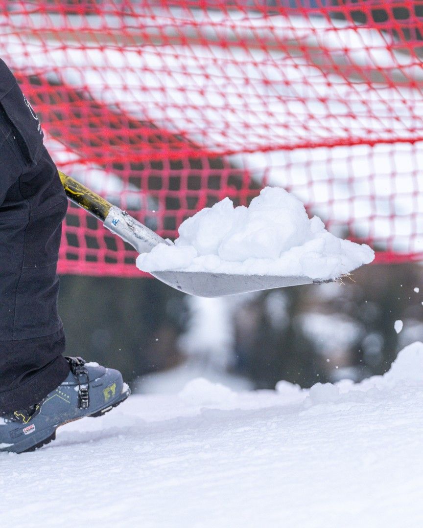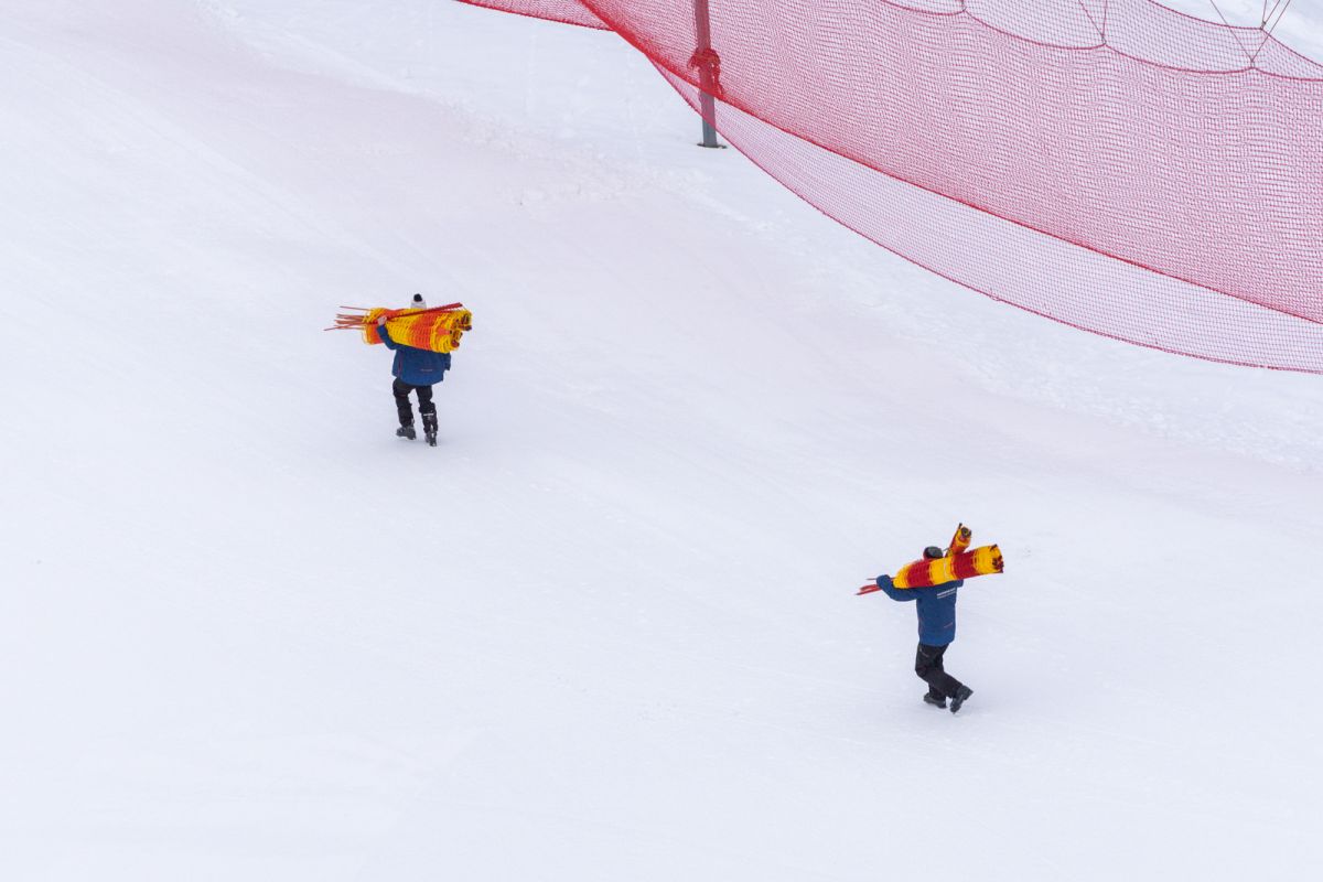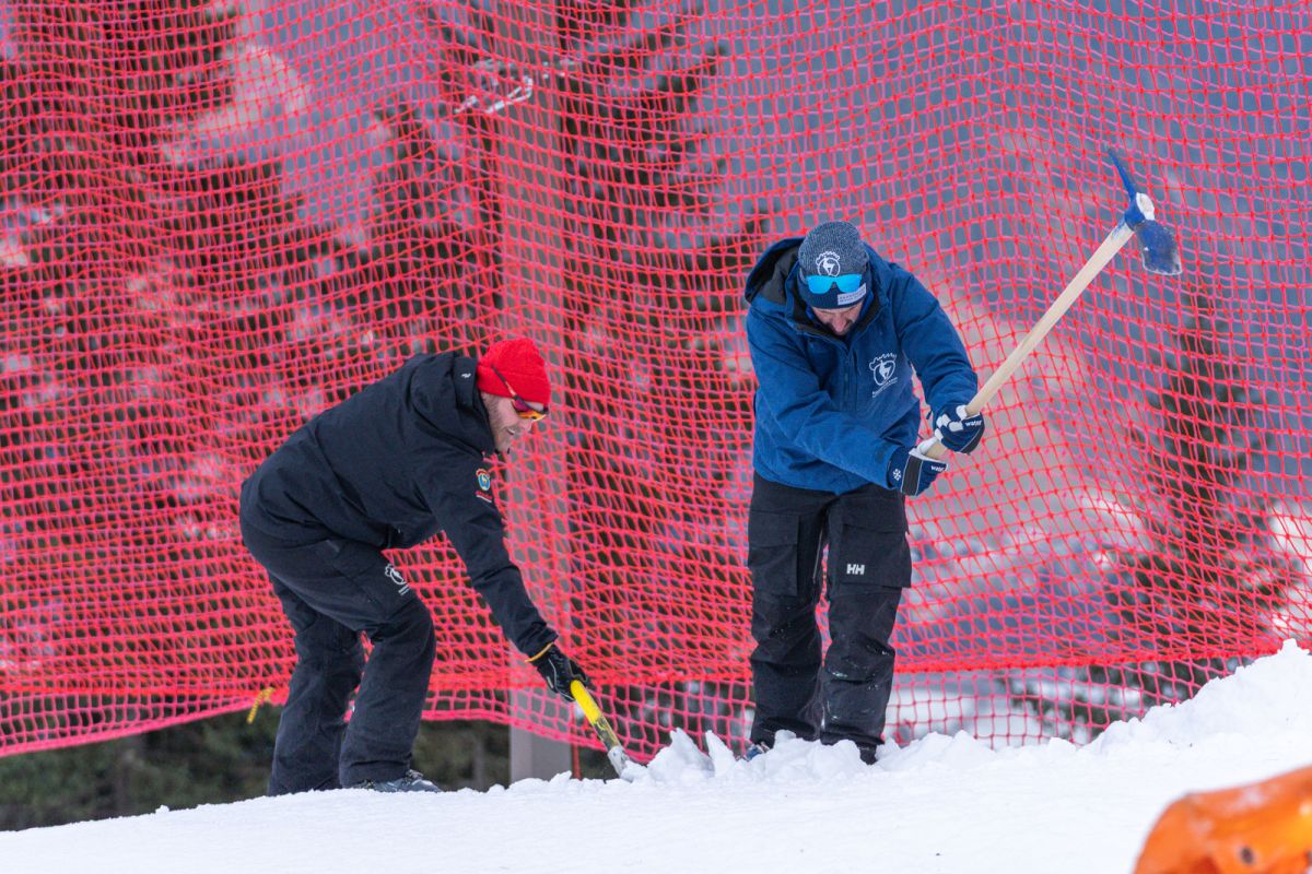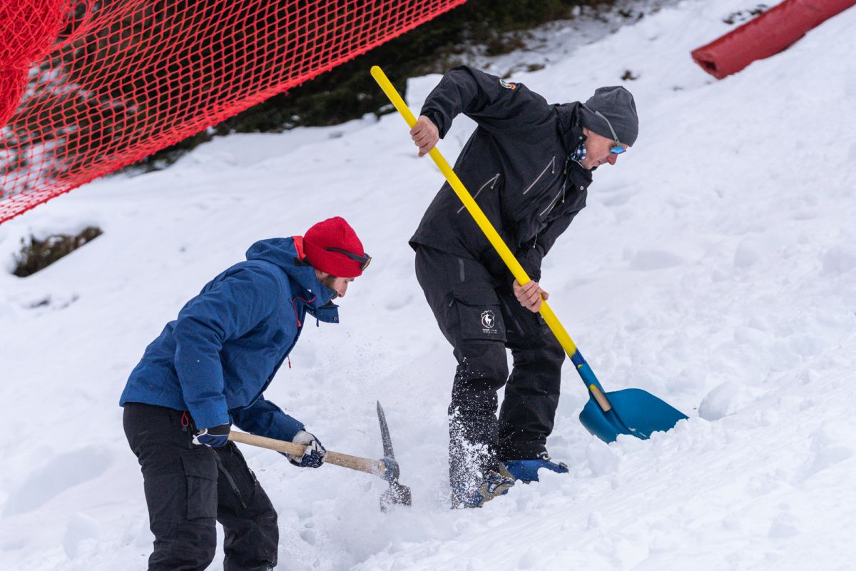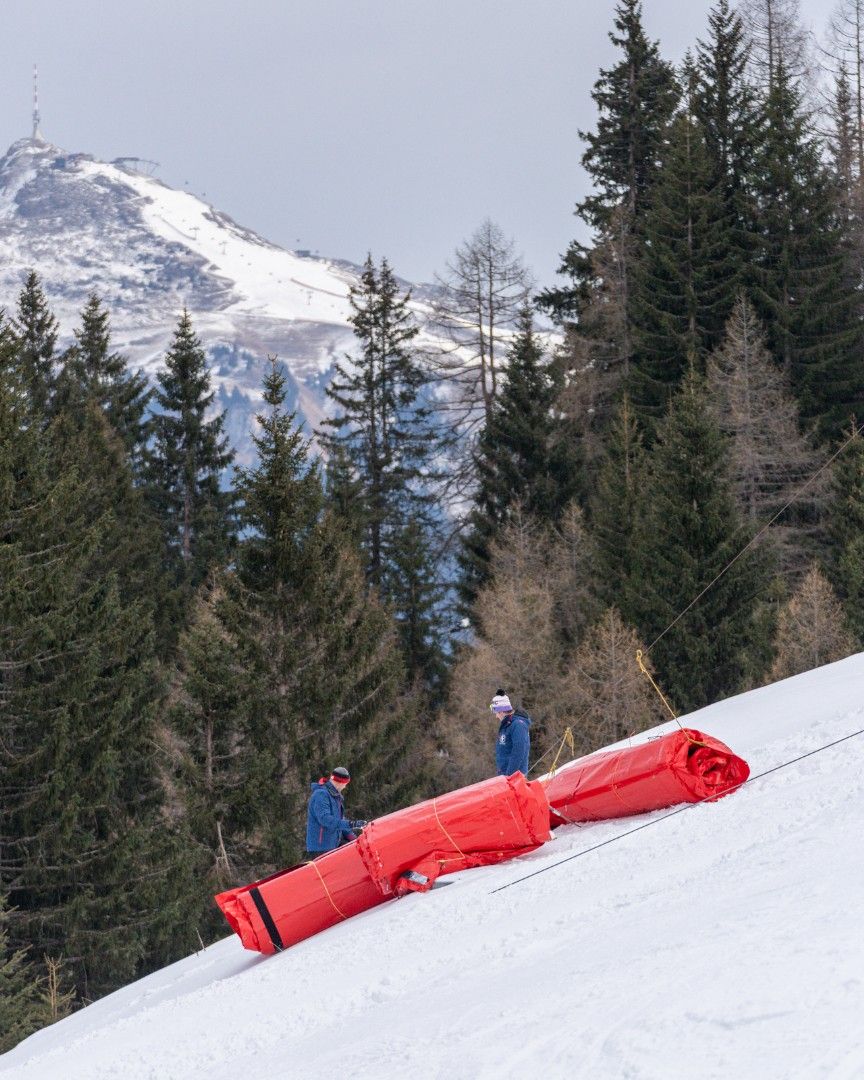 25 Mann stellte das Team Sicherheit am Freitag, Daniel ist einer davon: „Die Vorfreude am 2. Jänner mit den Arbeiten beginnen zu können, ist schon groß. Jede Aufgabe hat ihren Reiz und endlich kommt man wieder mit vielen Freunden zusammen, die man sonst über das Jahr nicht oft sieht.“ Zu tun gibt es bis zum ersten Training (voraussichtlich) am 20. Jänner noch reichlich: So sind u.a. 17 Kilometer Sicherheitsnetze, 180 Aufprallschutzmatten und 155 Luftkissen zu montieren – und zu transportieren. Dafür sorgt u.a. Jakob mit seinem Ski-doo, der den ganzen Tag den Hahnenkamm bergab und bergauf düst. „Von Pickeln und Schaufeln über Netze, Planen und Schläuche bis zu Wasserwerfern, wir bringen alles dorthin, wo es gebraucht wird. Bis zu vier Ski-doos sind im Einsatz.“ So fordernd die Aufgabe im steilen Gelände auch sein mag, für Jakob stehen Zusammenarbeit und Zusammenhalt im Vordergrund.
