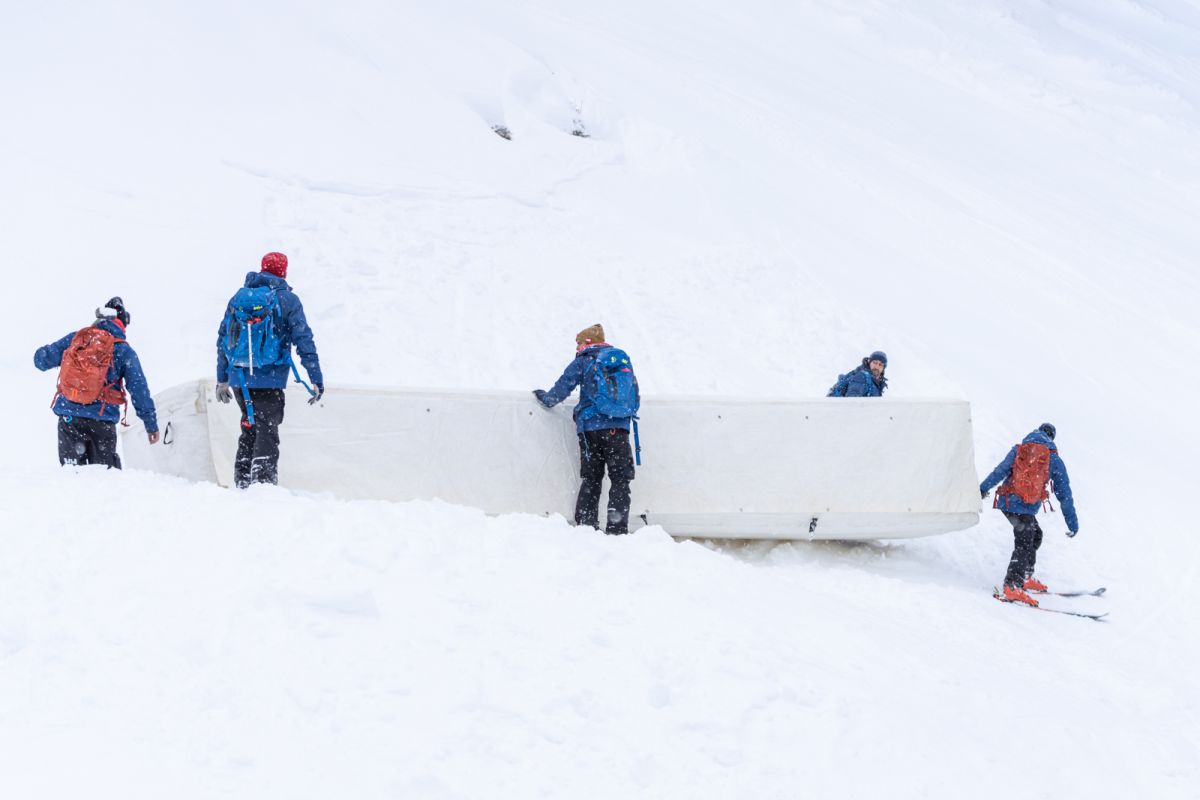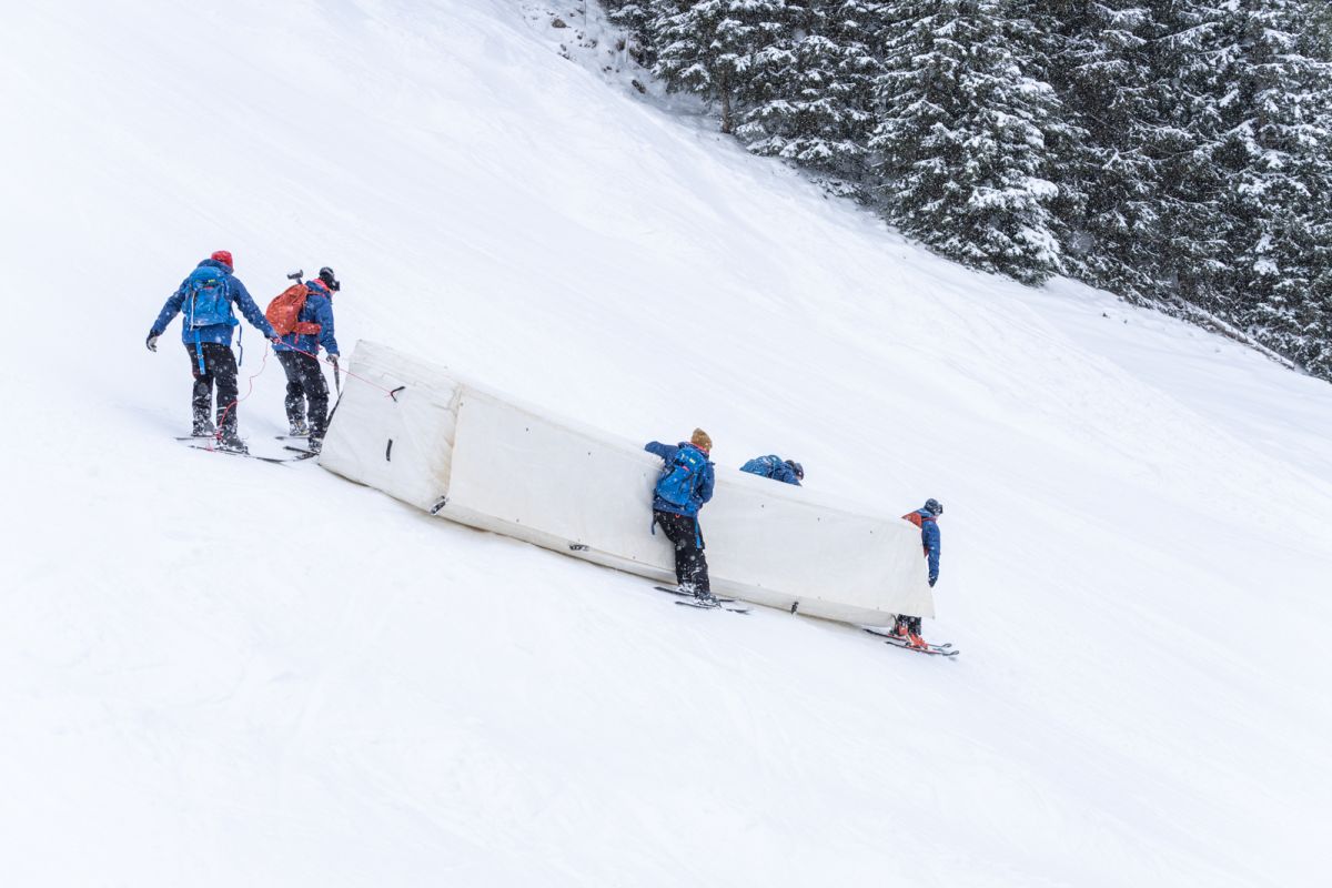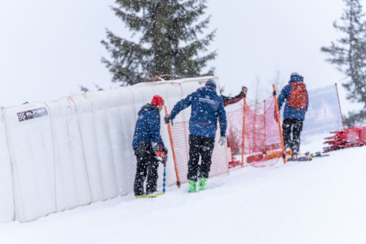 An der Mausefalle ist an diesem Montagvormittag das Sicherheitsteam voll gefordert. Es gilt die bis zu 140 Kilogramm schweren Luftkissen (Airfence) an Ort und Stelle zu bringen. In abschüssigem und rutschigen Gelände – direkt vor der Sprungkante – wahrlich keine einfache Aufgabe. Sicherheitschef Tom Voithofer strahlt aber die gewohnte Ruhe aus: „Heuer ist es super zum Arbeiten, denn wir haben überall genug Schnee und der Neuschnee hilft uns bei den Sturzräumen.“ Seit 2. Jänner ist er mit bis zu 30 Leuten am Hängen, Montieren und Verknoten: „25 Mann arbeiten an der Abfahrtsstrecke, bis zu vier Leute an der Einfahrtsstrecke auf der Ochsalm und drei sind mit den Ski-doos unterwegs.“