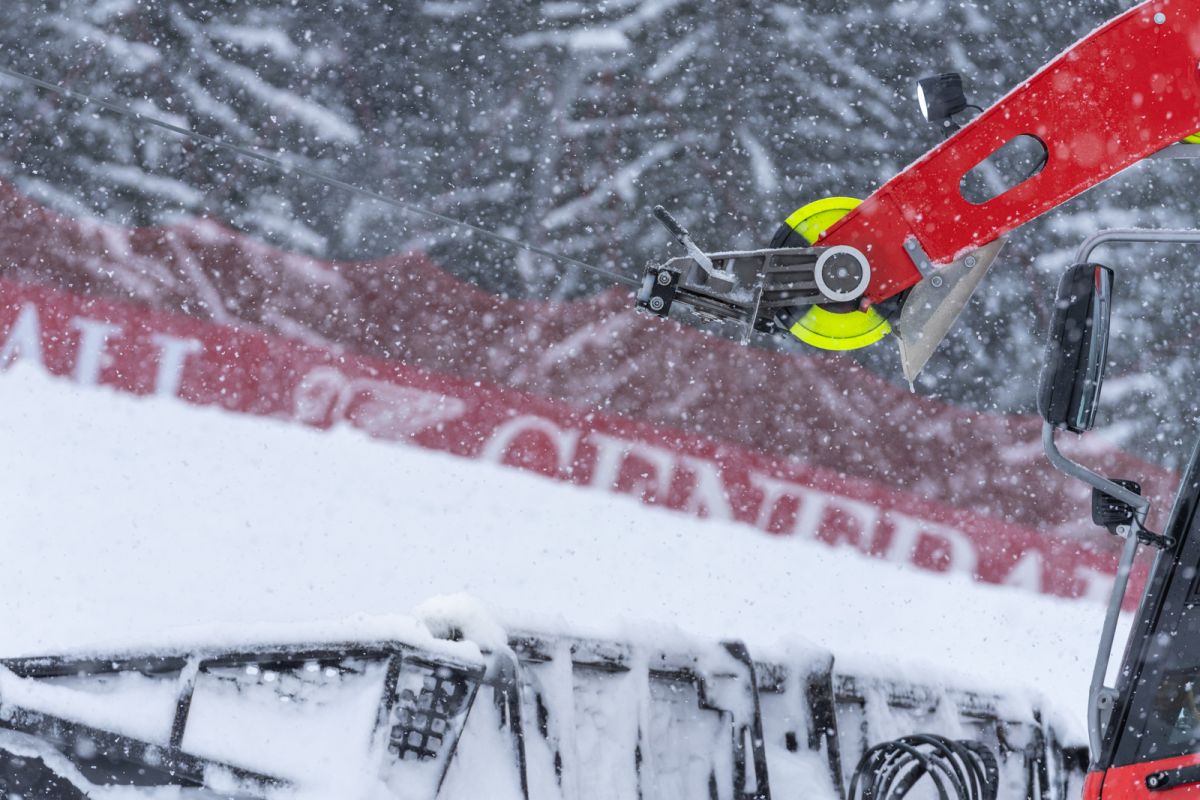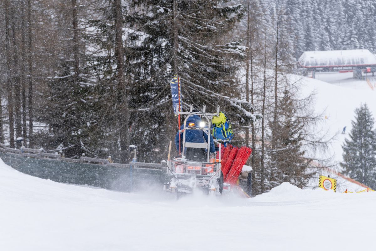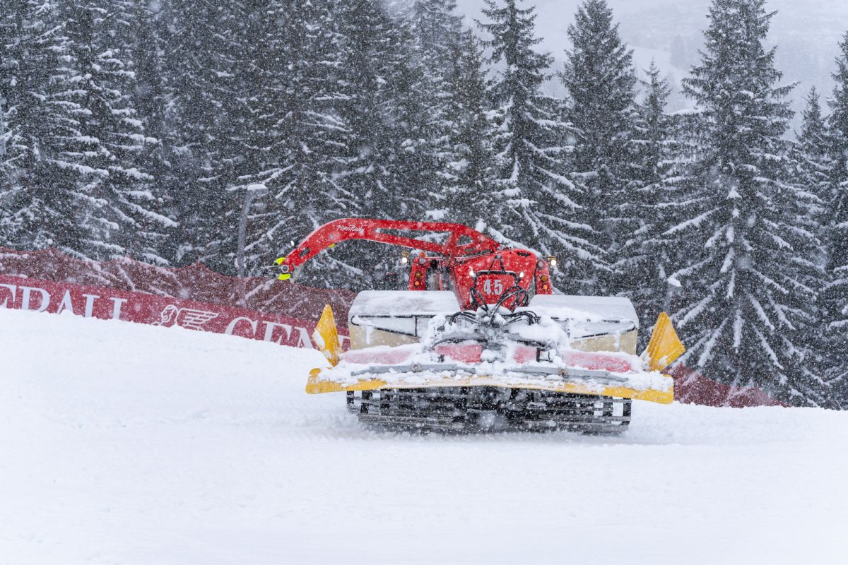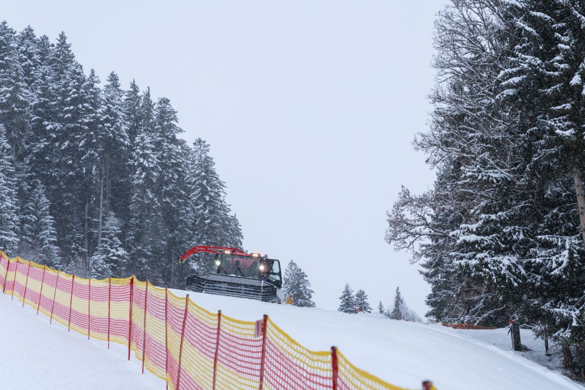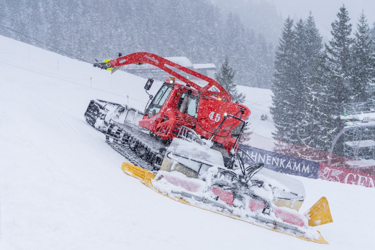 Auf den Rennstrecken sind zu Wochenbeginn gleich drei Pistenmaschinen der Bergbahn Kitzbühel im Einsatz – zwei auf der Streif, eine auf dem Ganslernhang. Das Ziel ist beiderorts dasselbe: den Neuschnee entweder aus der Strecke zu bringen oder mit dem – bereits bestehenden – technischen Schnee zu verbinden. Dafür wird Wasser beigemengt, damit die Schneekonsistenz leichter zu verarbeiten und dichter ist.